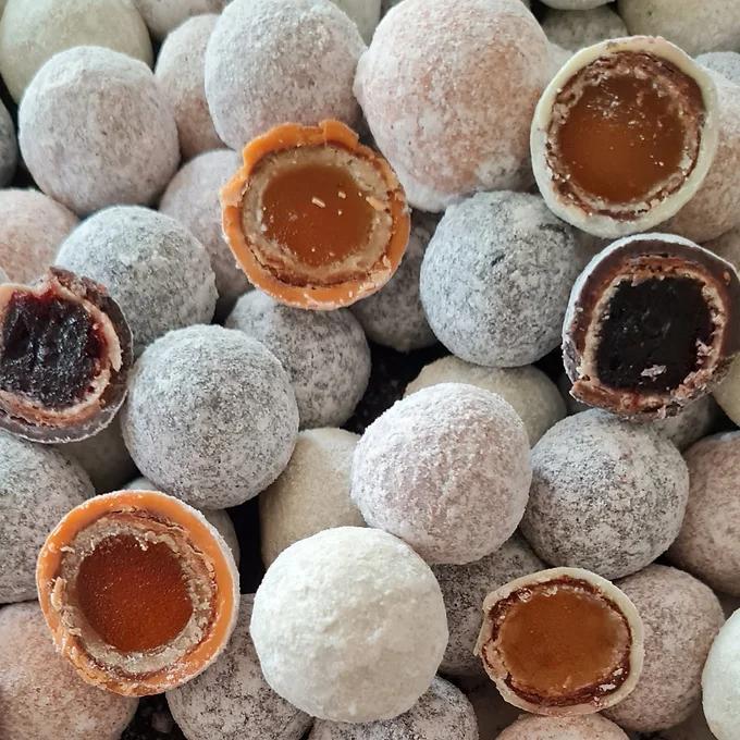 • elles vous en ferons voir de toutes les couleurs, fondantes à souhait, les cœurs de pâtes de fruits grand arôme  sont enveloppés  de pâte d'amandes puis enrobés de chocolat au lait et de chocolat blanc, onctueuses, un délice ! fabriquées à Oraison alpes de hte Provence par la maison doucet.
