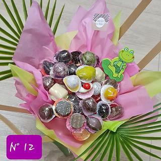 réalisation de ce bouquet chocolats (fabriqués dans notre région) chocolats (principalement) noir, lait, blanc, pralinés , ganaches mais aussi quelques douceurs (calisson, pâte de fruits, pâte d'amandes, douce Marion de chez doucet en Provence etc. La déco peut varier selon le stock du moment.